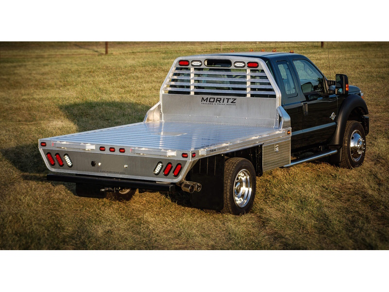 Moritz aluminum beds are tough and versatile. We provide standard features such as stake pockets and rub rail with pipe reinforcements in-between stake pockets, strong extruded decking for the floor, a recessed gooseneck hitch and adjustable frame rails.